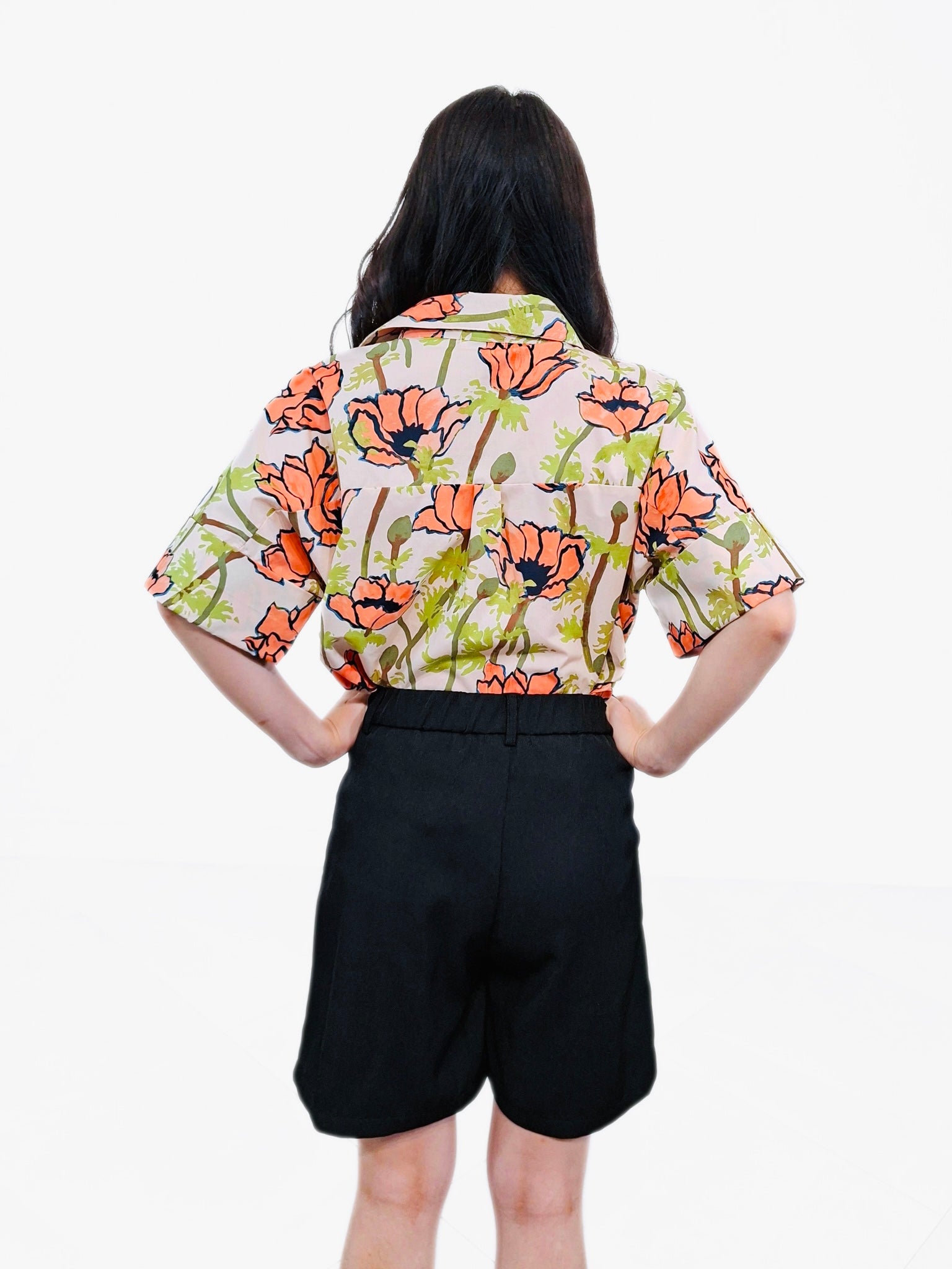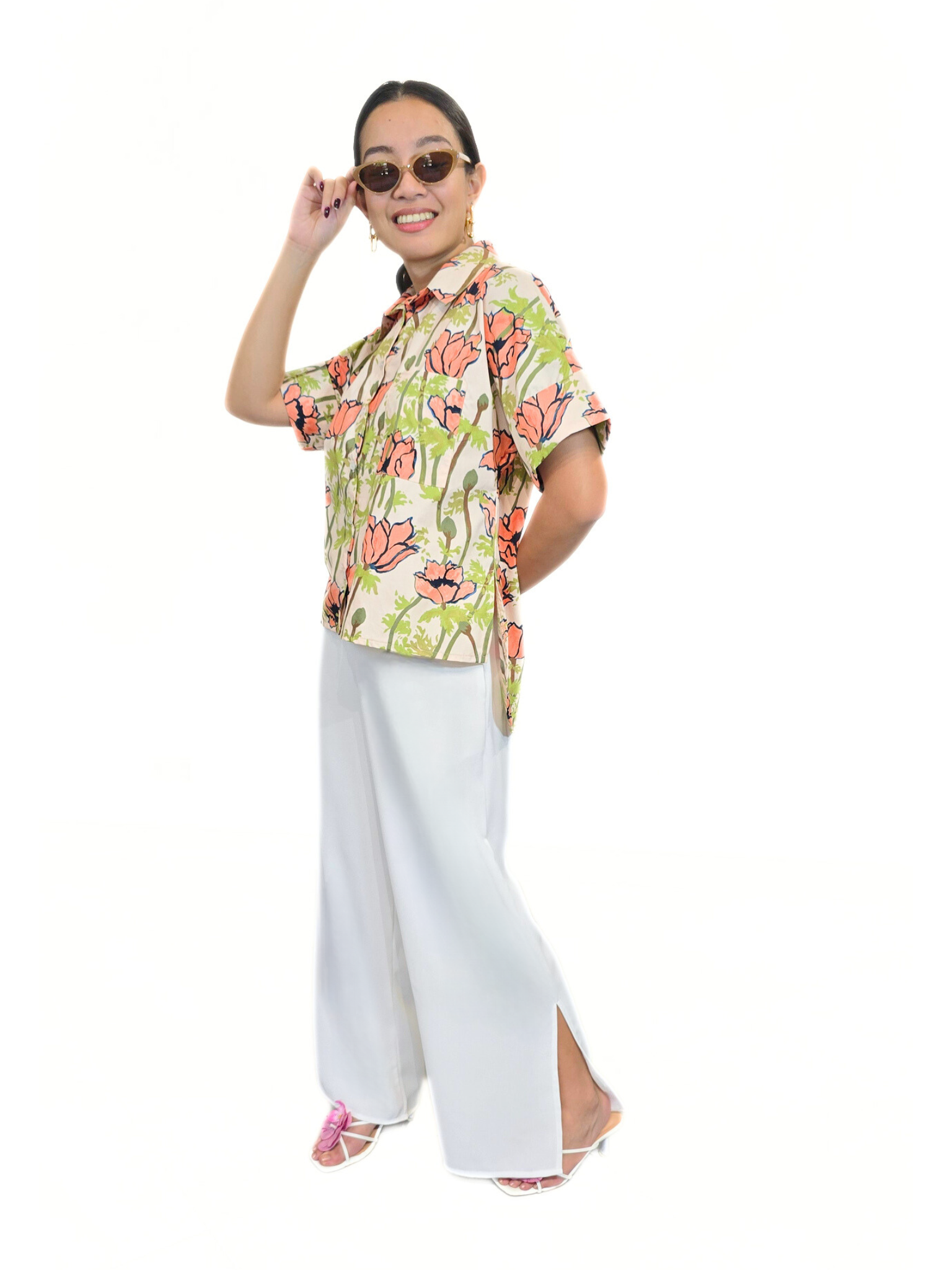AUDREY button-down top is a beautiful blend of botanical charm and effortless structure. It is a piece that feels like a summer garden in full bloom, designed for those who appreciate a relaxed yet curated aesthetic. The top features a striking hand-painted botanical illustration. Vibrant coral tulips with deep navy outlines stand tall against a background of lush green stems, all set upon a soft, creamy neutral base. A modern take on the classic camp shirt, it boasts a relaxed, boxy fit with a sharp pointed collar. The clean button-down front allows for versatile styling, whether worn fully closed or open over a camisole. Crafted from a crisp yet breathable material, the top holds its shape beautifully while remaining cool enough for tropical climates or warm sunny afternoons.