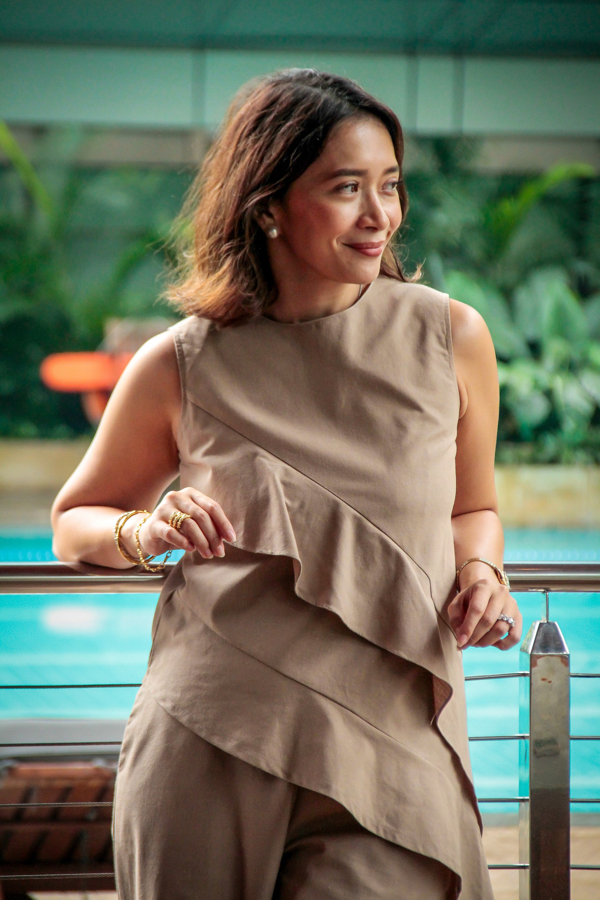 Cascading in lightweight linen with a dramatic ruffle accent, BIANCA top is definitely a versatile easy wear ensemble. Embrace your flirty feminine side while looking sleek. Pair with wide- hem, side slit Bianca pants to compete the statement day look.