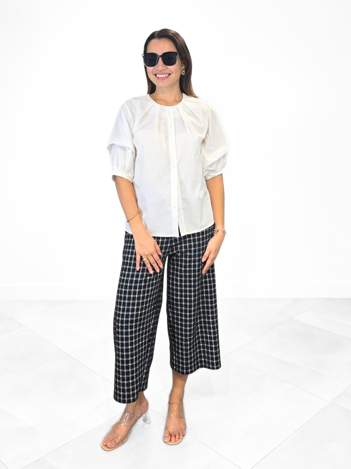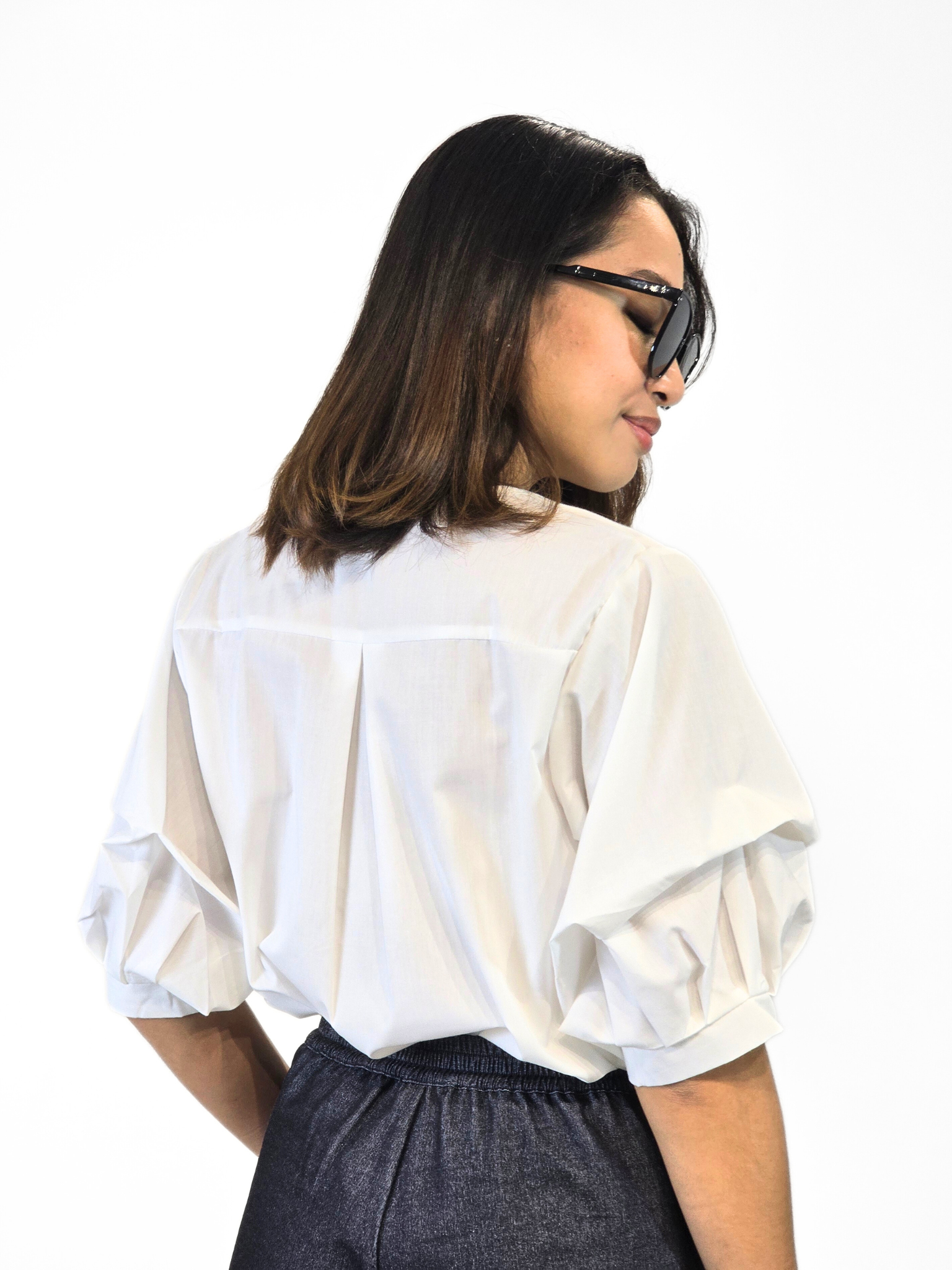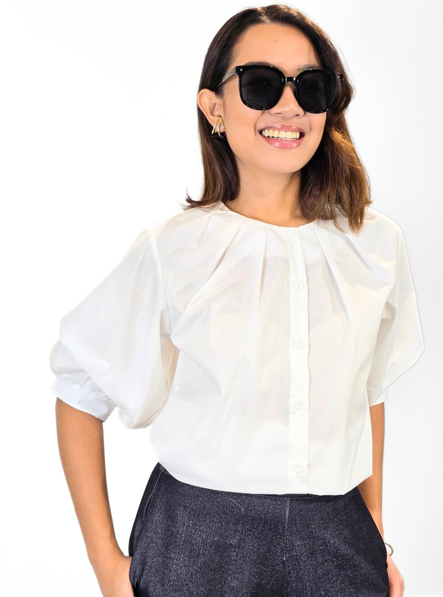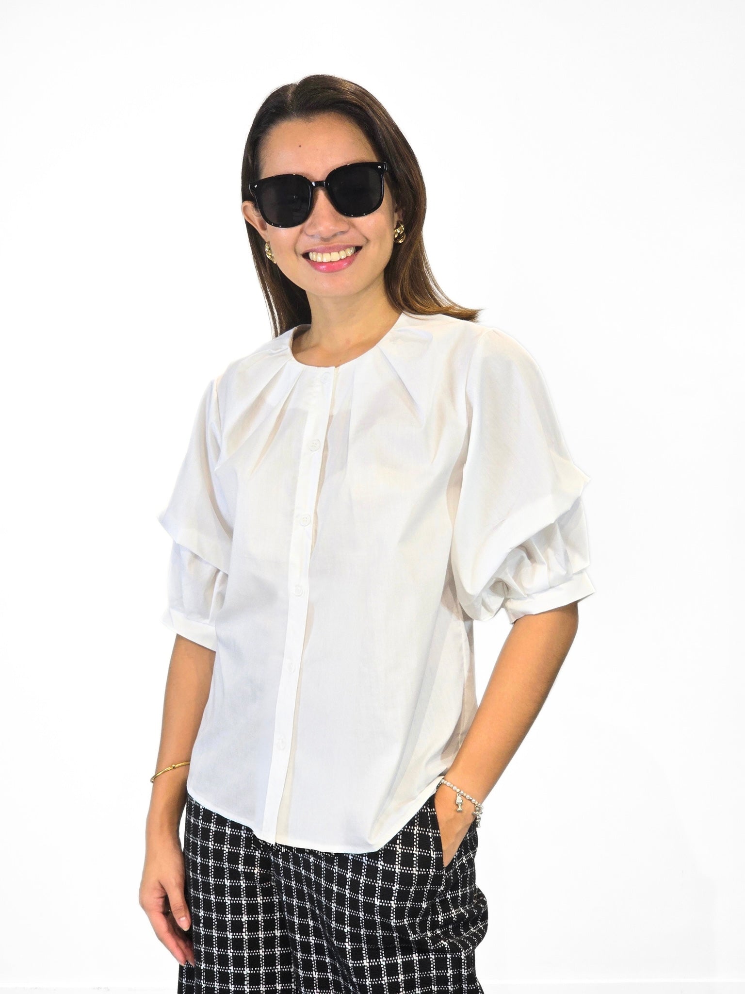 This features a round neckline accented with delicate pleats or gathers that add a touch of texture and softness. It fastens down the front with a row of small, matching buttons, creating a neat and polished look. The short, pleated accent sleeves are a key design element, adding a whimsical and voluminous silhouette that balances the top's bodice. This versatile piece can be dressed up or down for your EveryWear dressing.Â
