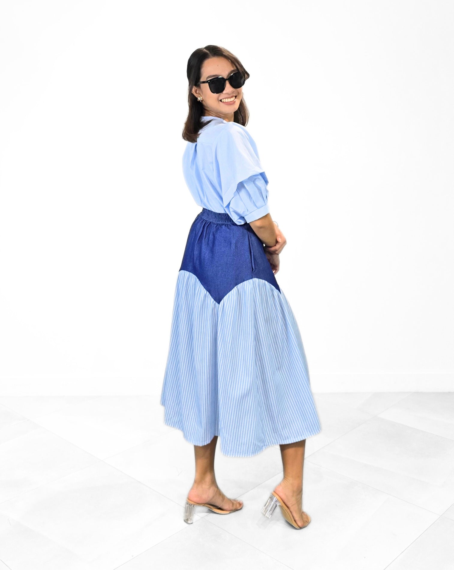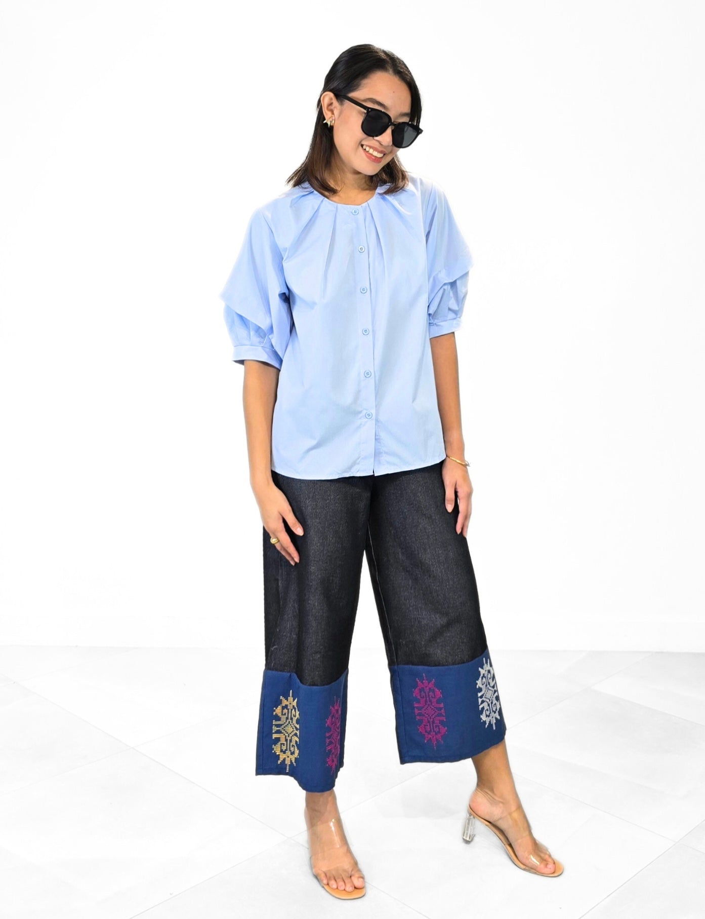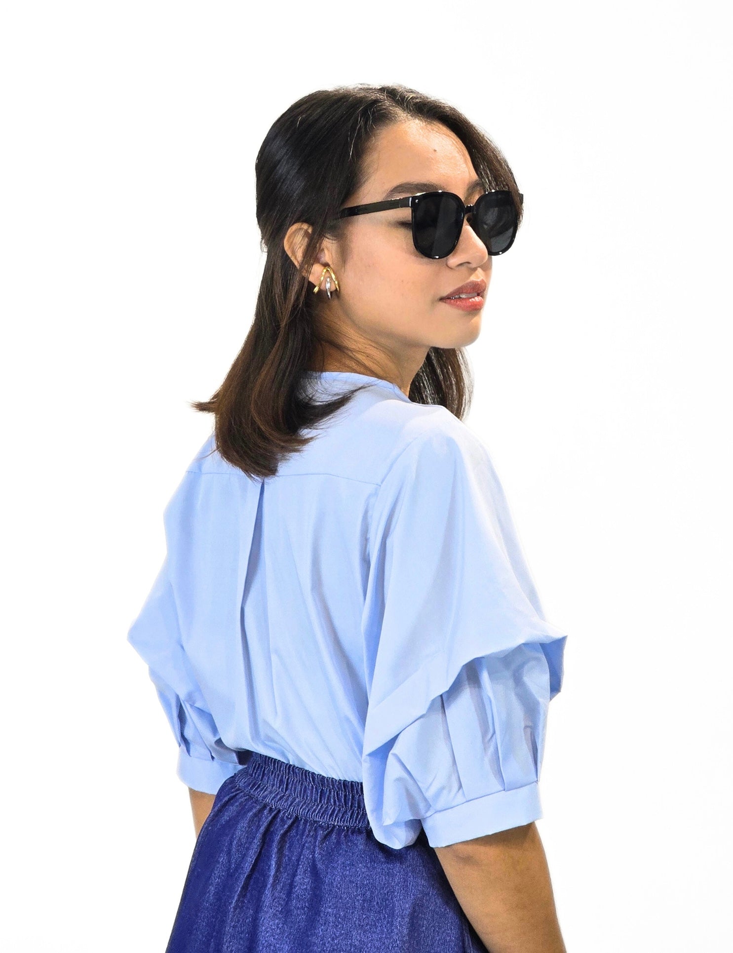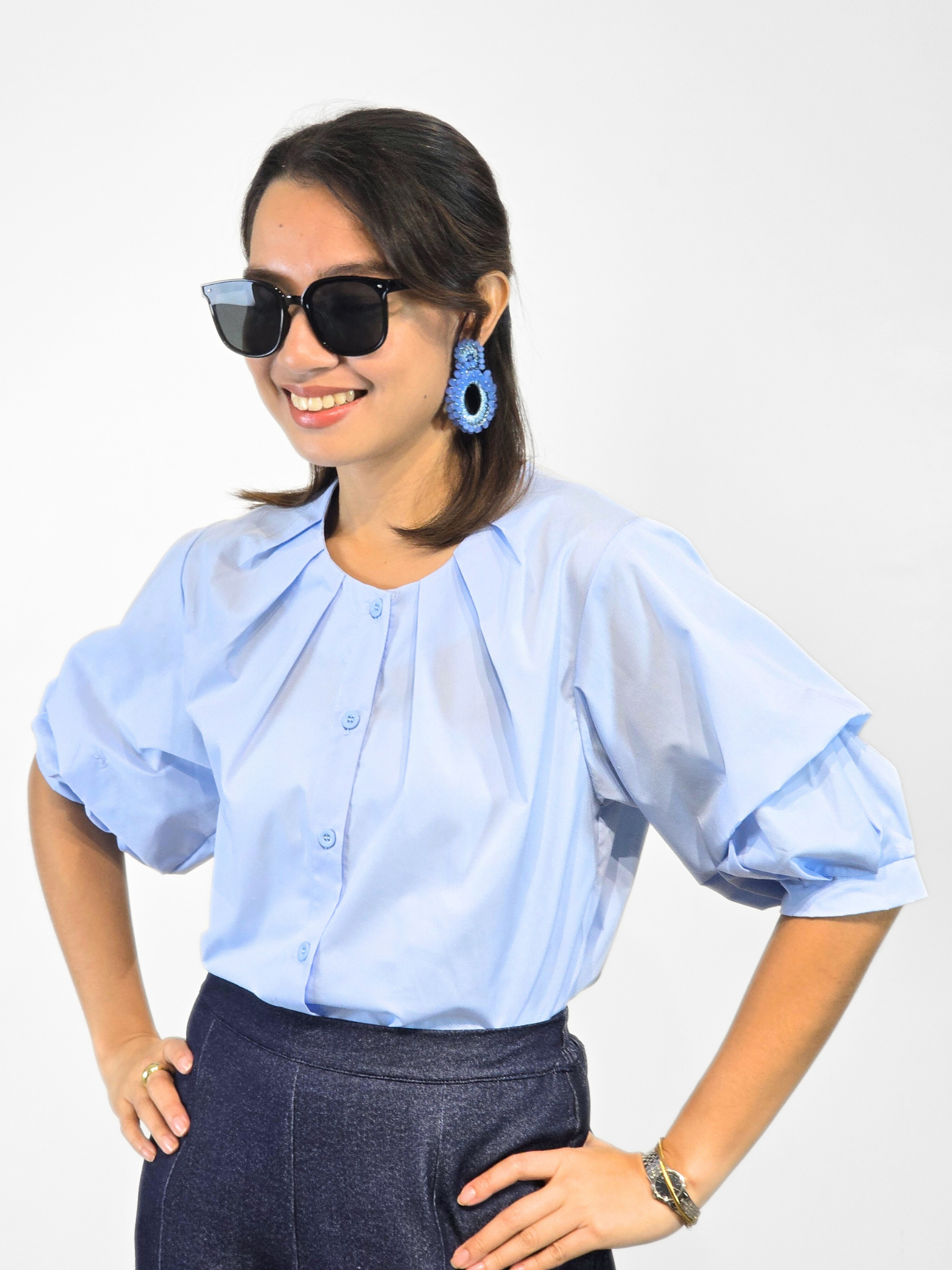 CAMILE is a crisp and charming blue top that combines classic elegance with playful details. It has a beautiful, clean blue fabric, which appears to be a lightweight cotton or linen blend.