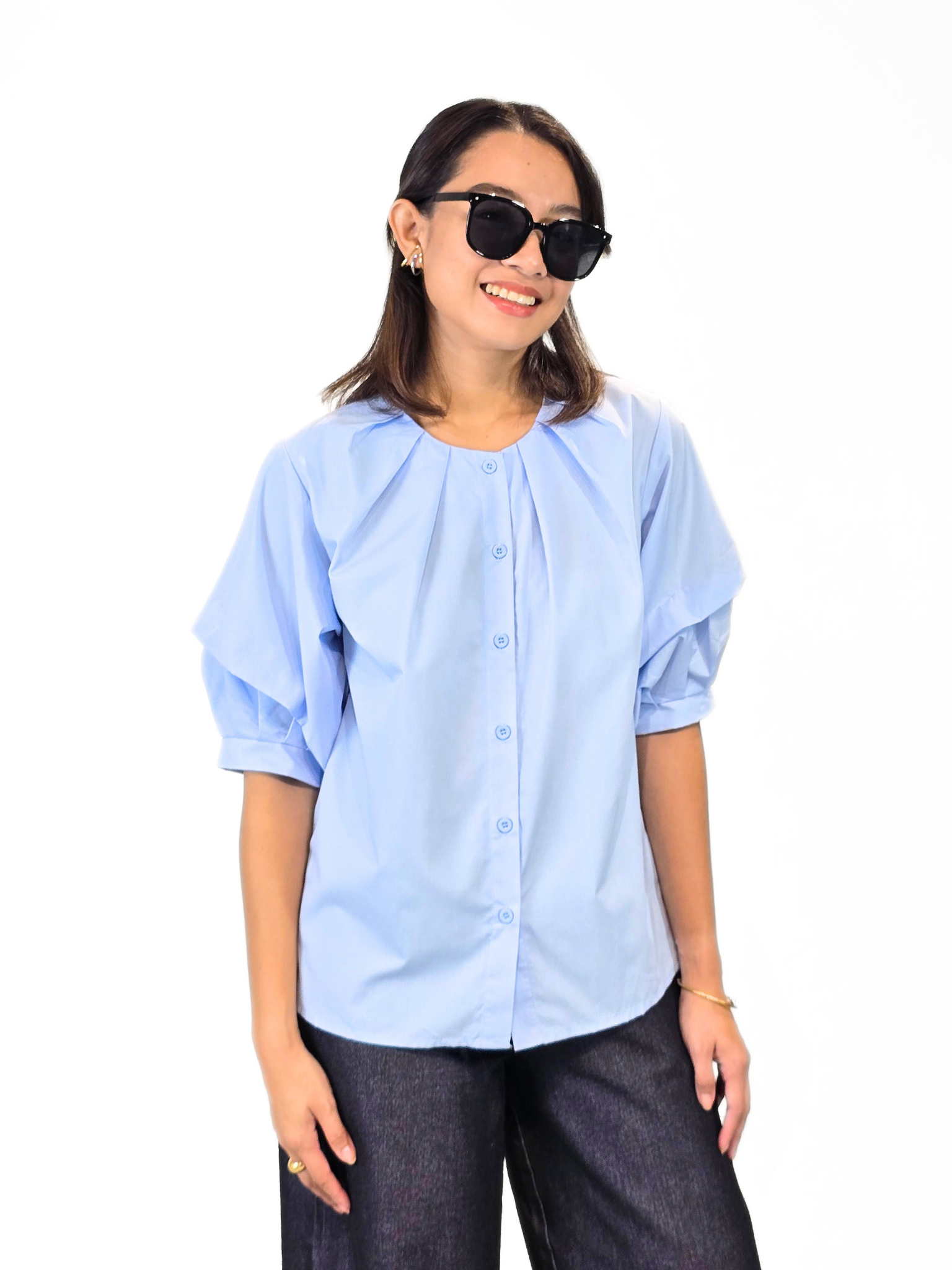This features a round neckline accented with delicate pleats or gathers that add a touch of texture and softness. It fastens down the front with a row of small, matching buttons, creating a neat and polished look. The short, pleated accent sleeves are a key design element, adding a whimsical and voluminous silhouette that balances the top's bodice. This versatile piece can be dressed up or down for your EveryWear dressing.Â