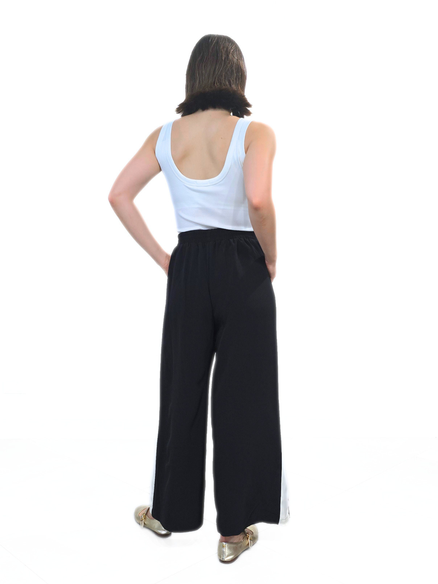 A contrasting vertical panel along the sides adds a striking, elongating effect, giving the pants a modern, streamlined finish. The elasticized waistband ensures a comfortable fit, making it an effortless choice for all-day wear.