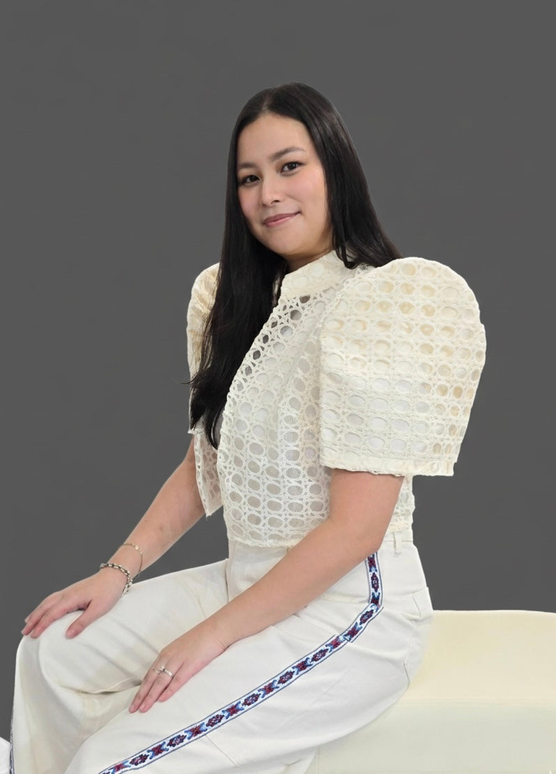 DALISAY bolero is a breathtaking fusion of traditional heritage and modern architectural design, serving as a contemporary homage to the iconic Filipiniana silhouette. Rendered in a delicate, cream-toned eyelet lace, the jacket features a intricate geometric pattern that provides both visual depth and an airy, breathable feel. The centerpiece of the design is its structured butterfly sleeves, which are expertly pleated to maintain a sharp, upward flare that frames the face with regal elegance. This top is a true conversation piece, perfect for the woman who values cultural storytelling and refined, artisanal craftsmanship in her everyday wardrobe.