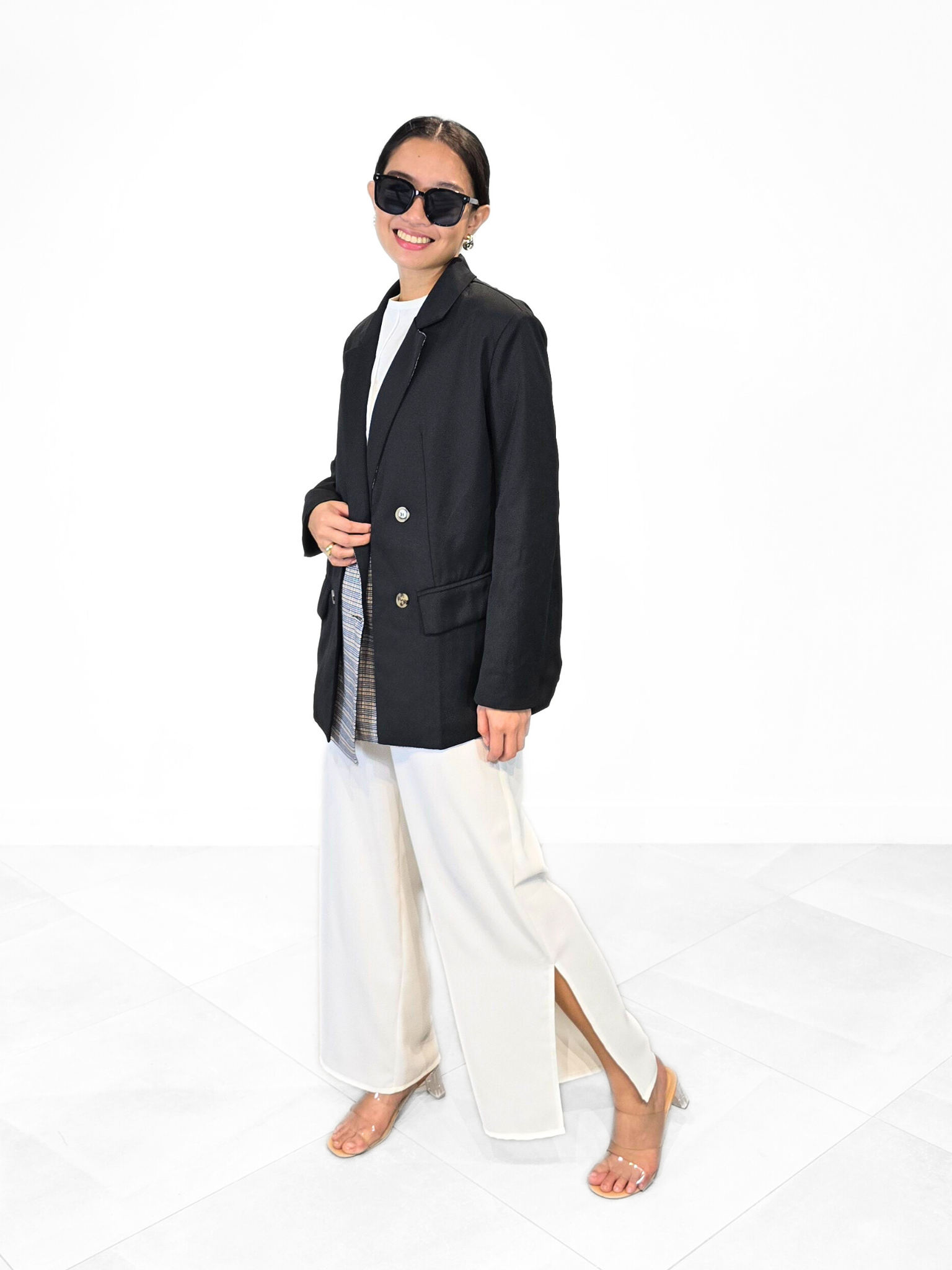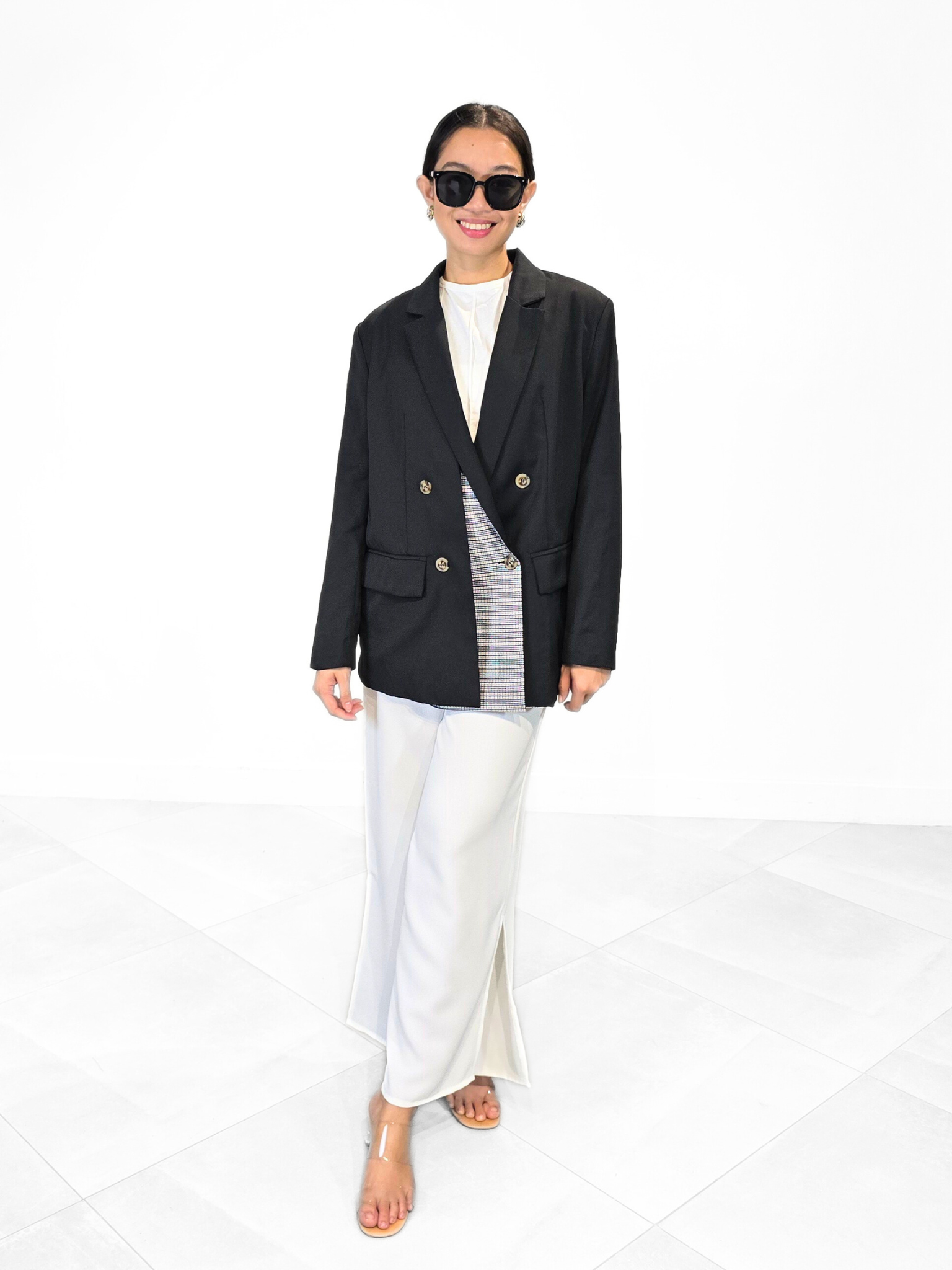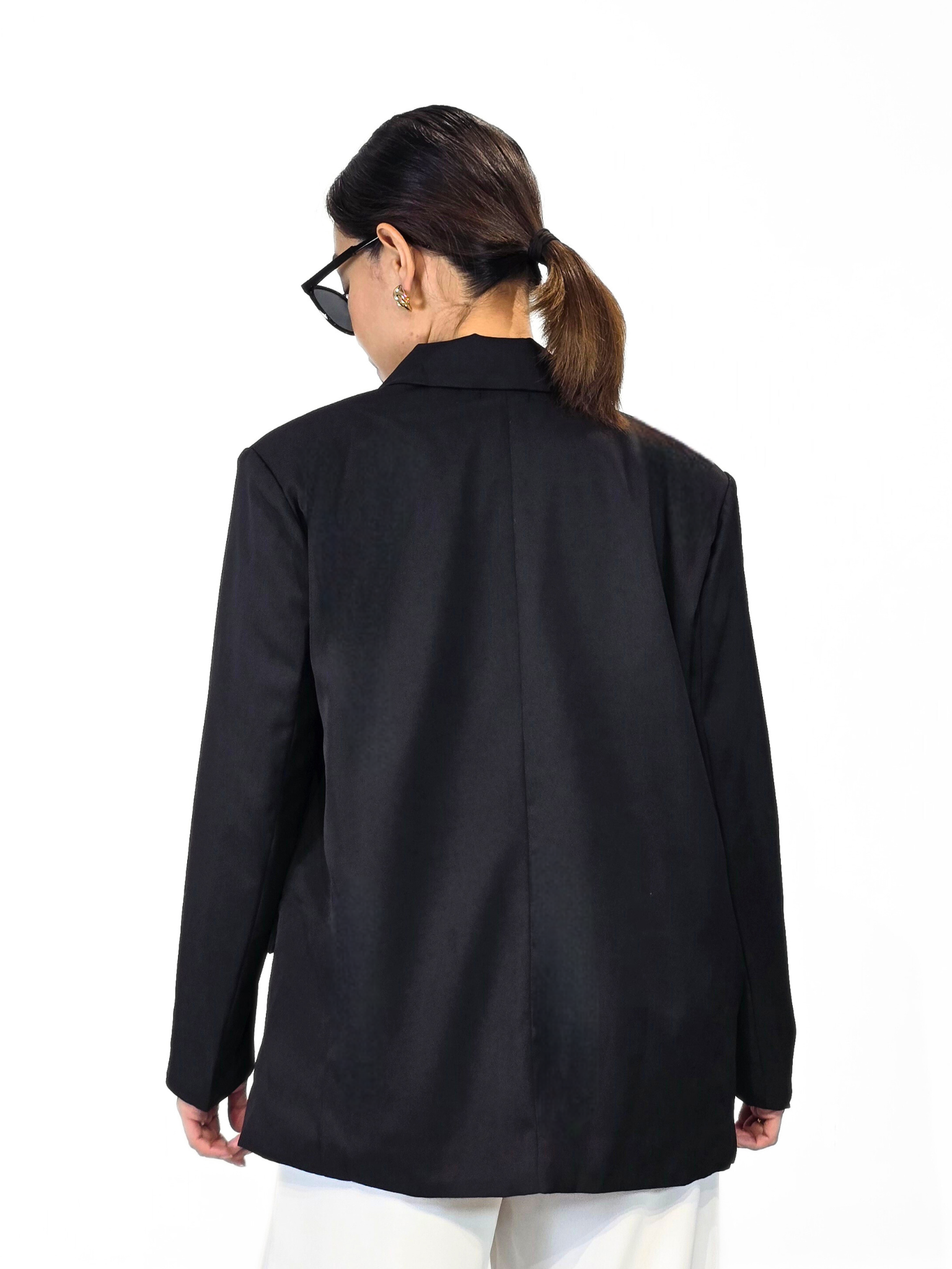 DANI double-breasted blazer showcases a refined, contemporary design. It features elegant gold buttons that provide a striking contrast against the deep black fabric. With its generous, boxy fit, two front pockets, and classic lapels, this blazer blends traditional tailoring with a modern, relaxed aesthetic, making it an essential piece for a well-rounded wardrobe.