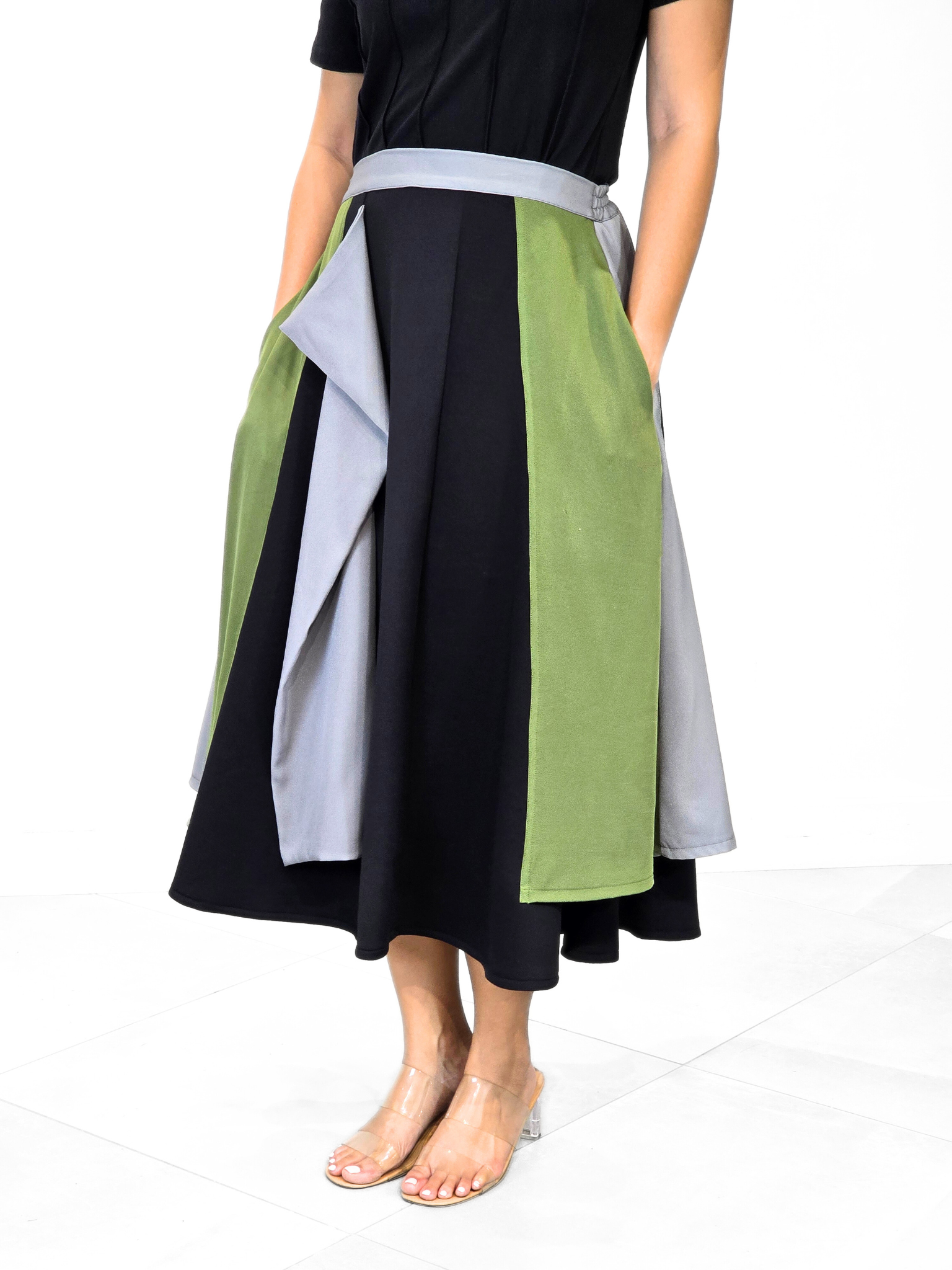 EIKO skirt features a bold, three-panel construction with distinct colors and textures that create a dynamic, modern look. The primary panels are a deep, classic black and a rich olive green. A third panel, a smooth, light gray, is artfully draped and folded over the front, adding a sculptural and architectural element.