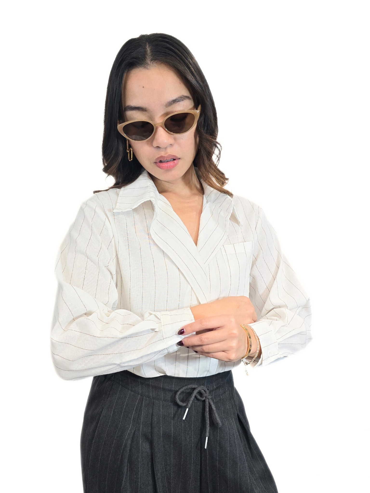 ALEX crema pinstripe blouse strikes perfectly between professional polish and relaxed style. This top features a soft-drape material, subtly textured like chambray, accented by crisp, thin white vertical pinstripes for an elongating effect. The neckline boasts a classic pointed collar that is designed to be worn open, creating a flattering v-neckline that frames the collarbone beautifully. Roll the sleeves up for a more casual look, and a discreet single patch pocket on the left chest, adding a touch of utility styling.