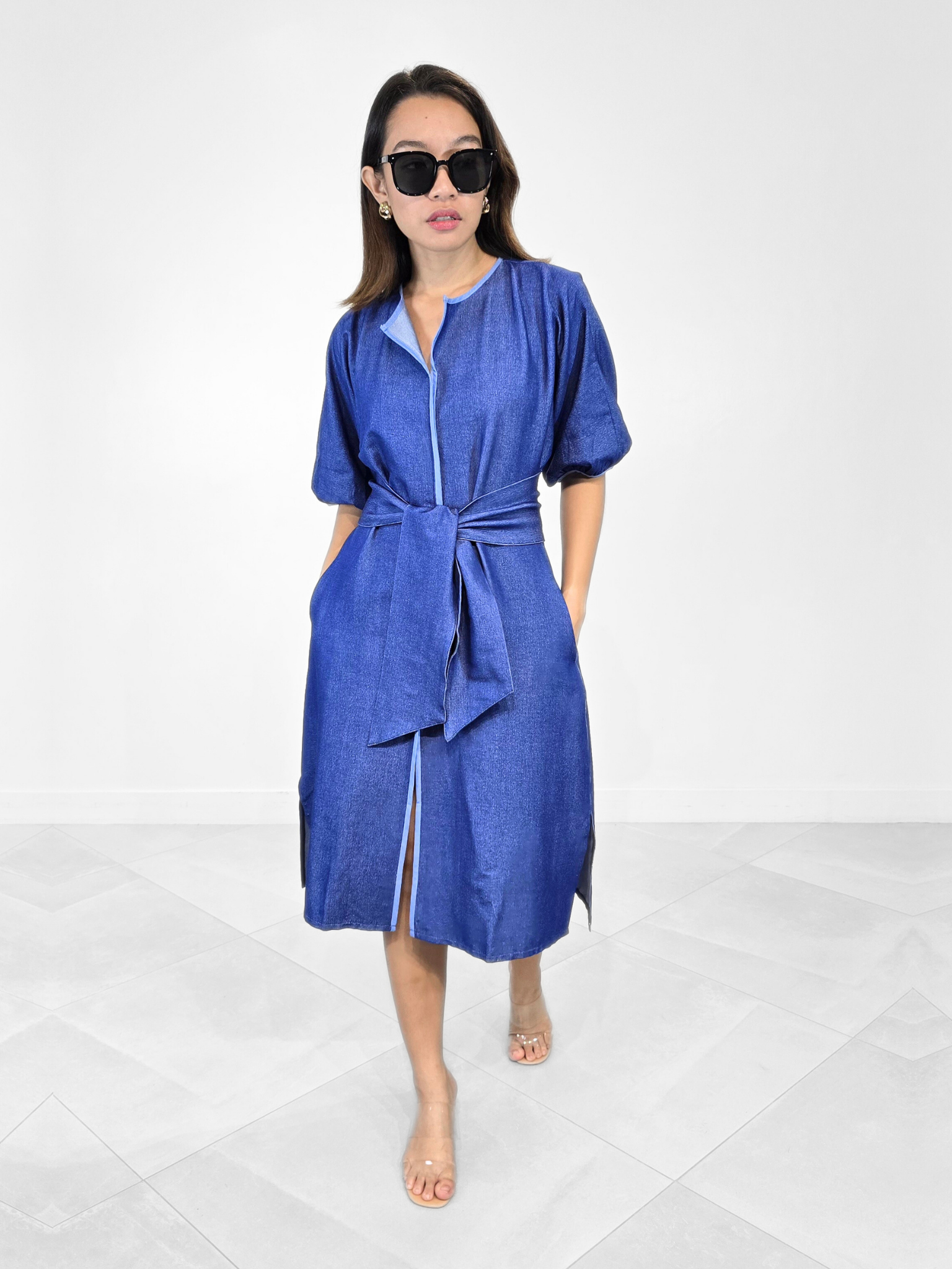 A central seam that runs vertically down the front of the dress, highlighted by a contrasting light blue trim which elongates the body and adds a subtle pop of color. Tie the belt in a variety of ways—a simple knot, a bow, or left loose—to create different silhouettes and moods. Lastly, the dress has short, puffed sleeves that add a touch of feminine charm. Pair Farah with clear heels and sunglasses, perfect for a casual outing or a stylish daytime event.