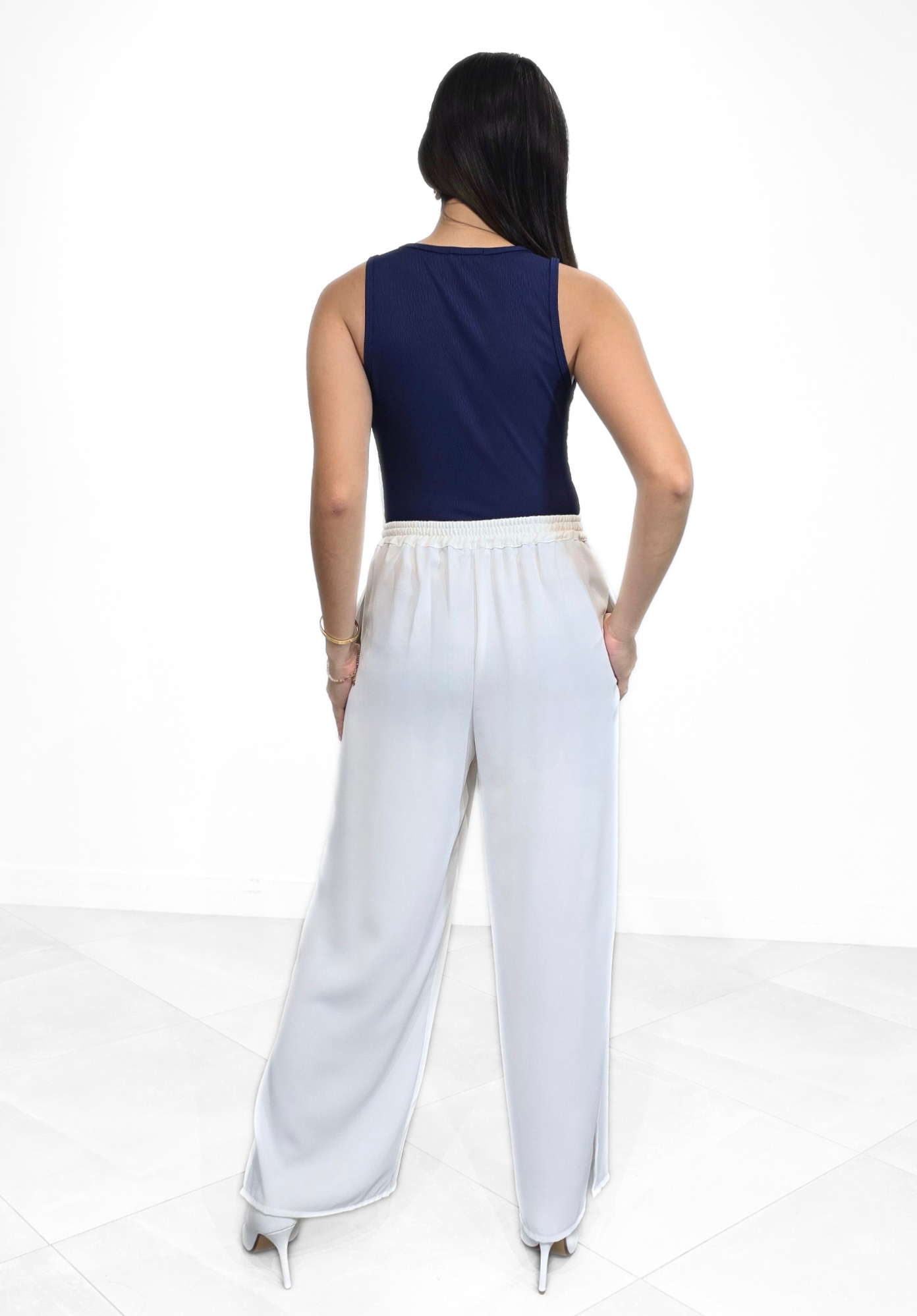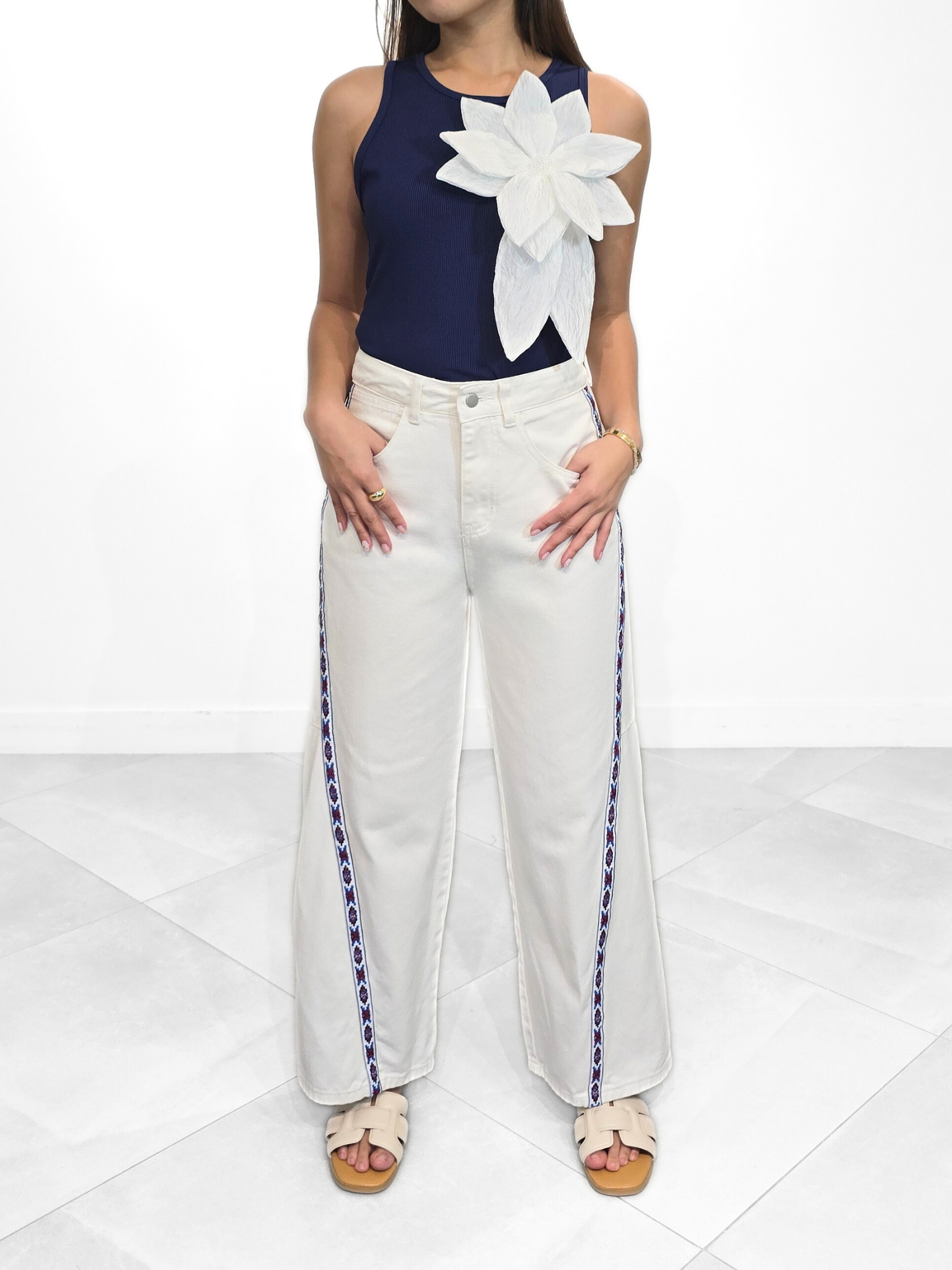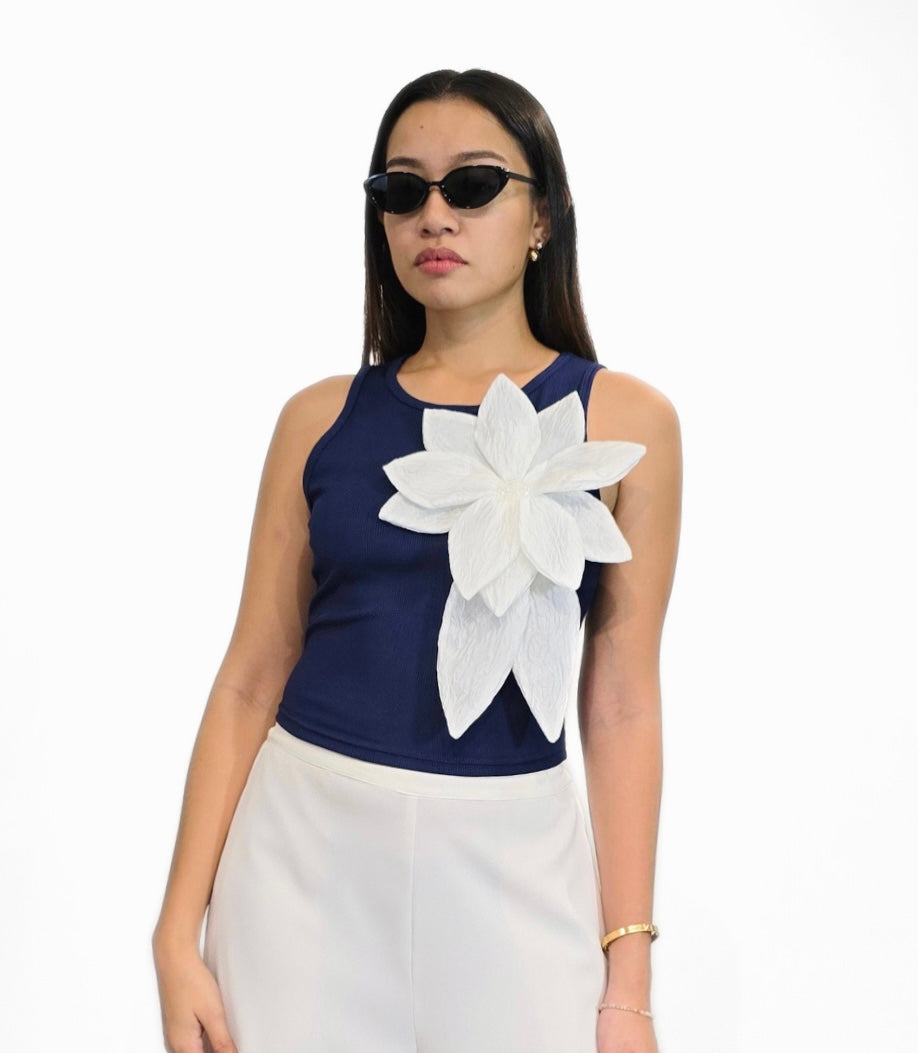 This piece reimagines the classic summer staple through a lens of avant-garde elegance. Crafted from a deep, midnight-navy ribbed knit, the top offers a sleek, silhouette that provides the perfect minimalist canvas for its focal point. The shoulder is adorned with an 3D architectural floral applique. Its crisp white petals feature a delicate, paper-like texture that creates a dramatic, ethereal contrast against the dark fabric. Complimented with a classic crew-neckline and sleeveless design keeps the look grounded and versatile, making it as suitable for a gallery opening as it is for an upscale brunch.