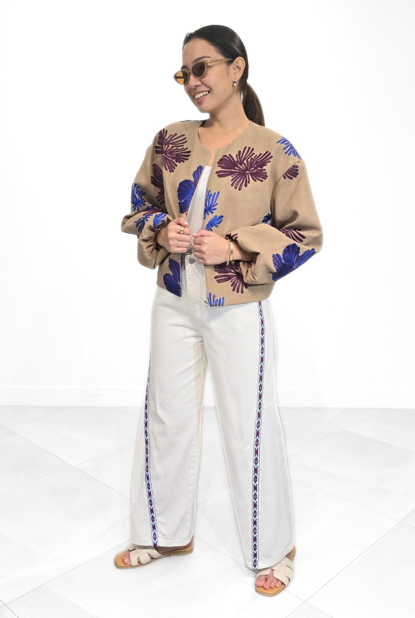 A Fusion of Heritage and Contemporary Chic. HAVANA is an exquisite bomber jacket reimagines classic outerwear through a lens of sophisticated texture and bold artistry. Crafted from a premium sandy-beige linen-blend, the fabric features a subtle, refined cross-hatch weave that provides a breathable yet structured silhouette. The piece is defined by oversized, hand-styled botanical motifs. The deep royal blues and rich plums are rendered in high-density embroidery, creating a beautiful tactile contrast against the neutral backdrop.