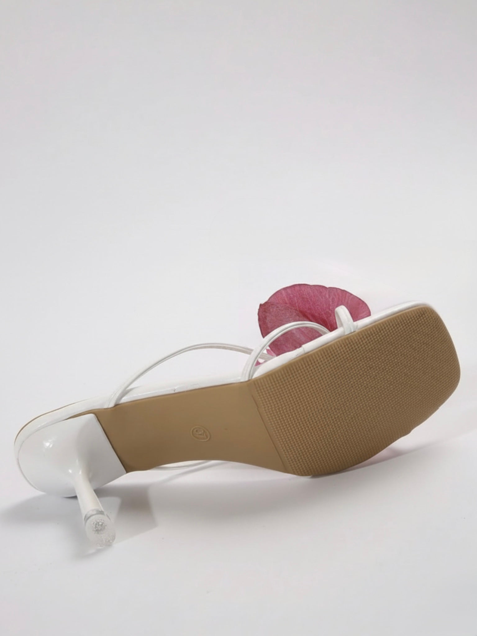 FLORA heels is a stunning, delicate slip-on mules that perfectly capture the essence of spring and tropical romance. The shoe features a low-to-mid height flared kitten heel in crisp white, giving them a modern, comfortable lift. The straps are thin, elegant white ties that crisscross over the foot. The highlight of the design is the oversized, three-dimensional orchid appliqué in a vibrant hot pink and fuchsia shade, dramatically affixed to the front. This floral detail transforms a simple heel into a statement piece of wearable art, perfect for garden parties or warm-weather celebrations.