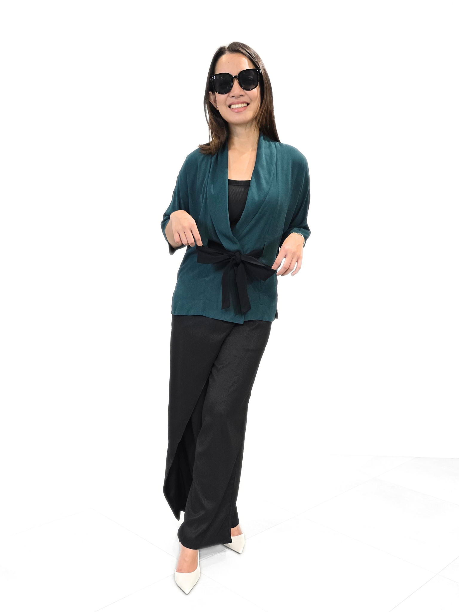 KITTS sophisticated teal wrap-top strikes a perfect balance between traditional influence and modern minimalism. Crafted in a deep, jewel-toned emerald teal, it features a fluid silhouette that conveys both professional elegance and relaxed grace. The wide, shawl-style collar creates a clean, structured frame that transitions seamlessly into the wrap front. Capped off with a fabric that has a matte finish and a substantial drape, suggesting a high-quality crepe or silk-blend that—perfect for a long day in the studio or an evening event.