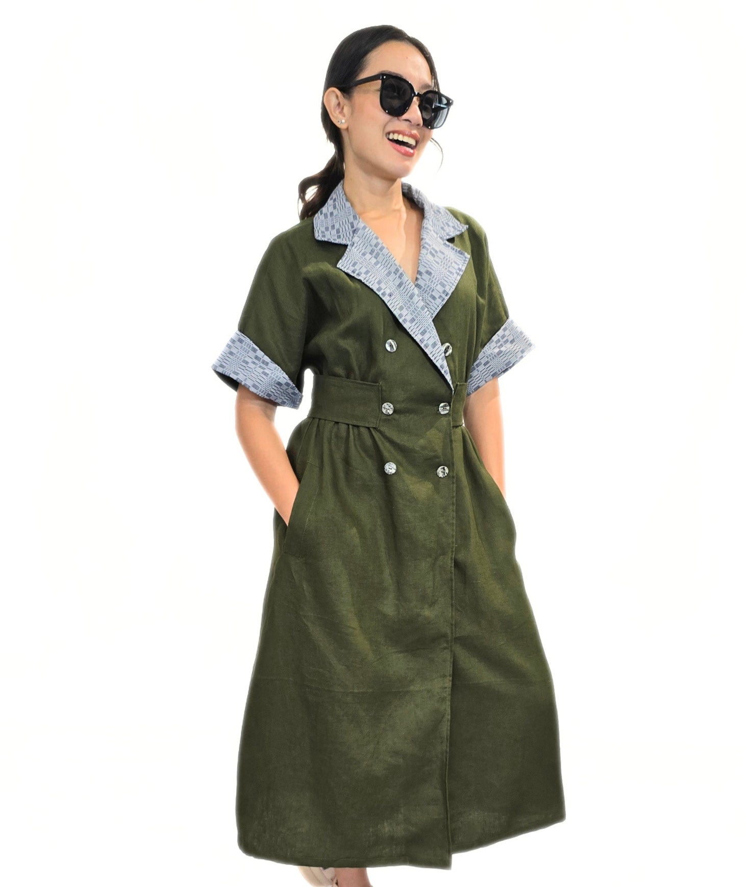 LANA dress is a masterful take on local weaves meets inspired power dressing, blending the structured elegance of a classic trench with a vibrant, modern soul. Its striking crimson hue and playful pattern play make it an undeniable statement piece for the woman who isn't afraid to lead the conversation. The structured, four-button bodice offers a nod to timeless tailoring, providing a sharp and polished silhouette. Discreetly placed side pockets combine everyday practicality with high-fashion poise.