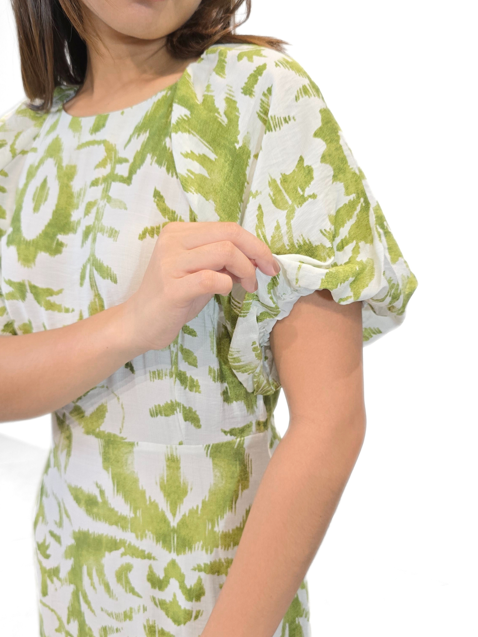 The silhouette is both romantic and comfortable, with a tailored waist that gives way to a long, flowing skirt. The upper half is softened by charming semi-puffed sleeves that hit just above the elbow. Styled with a neon green bag and eye-catching pink FLORA sandals, this dress is the epitome of cheerful, sophisticated resort wear.