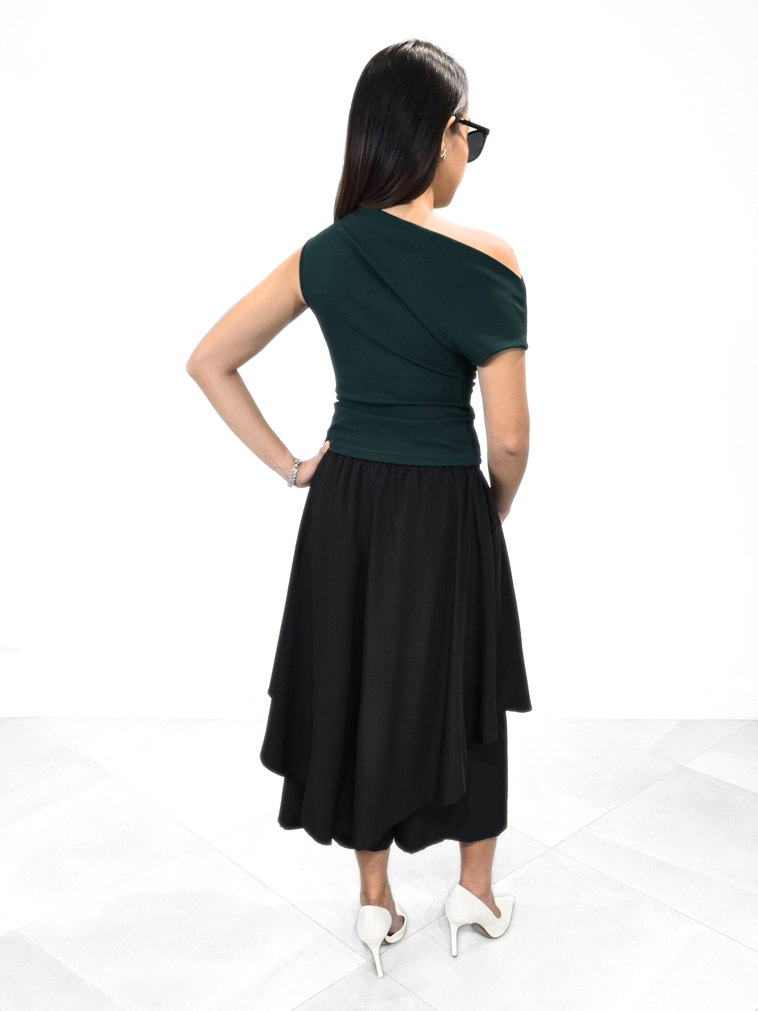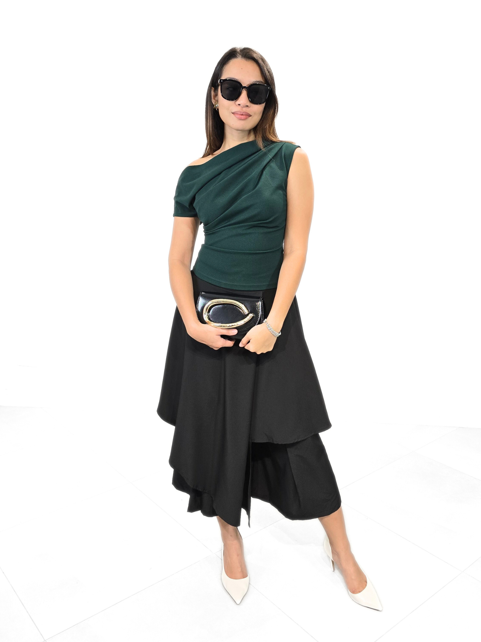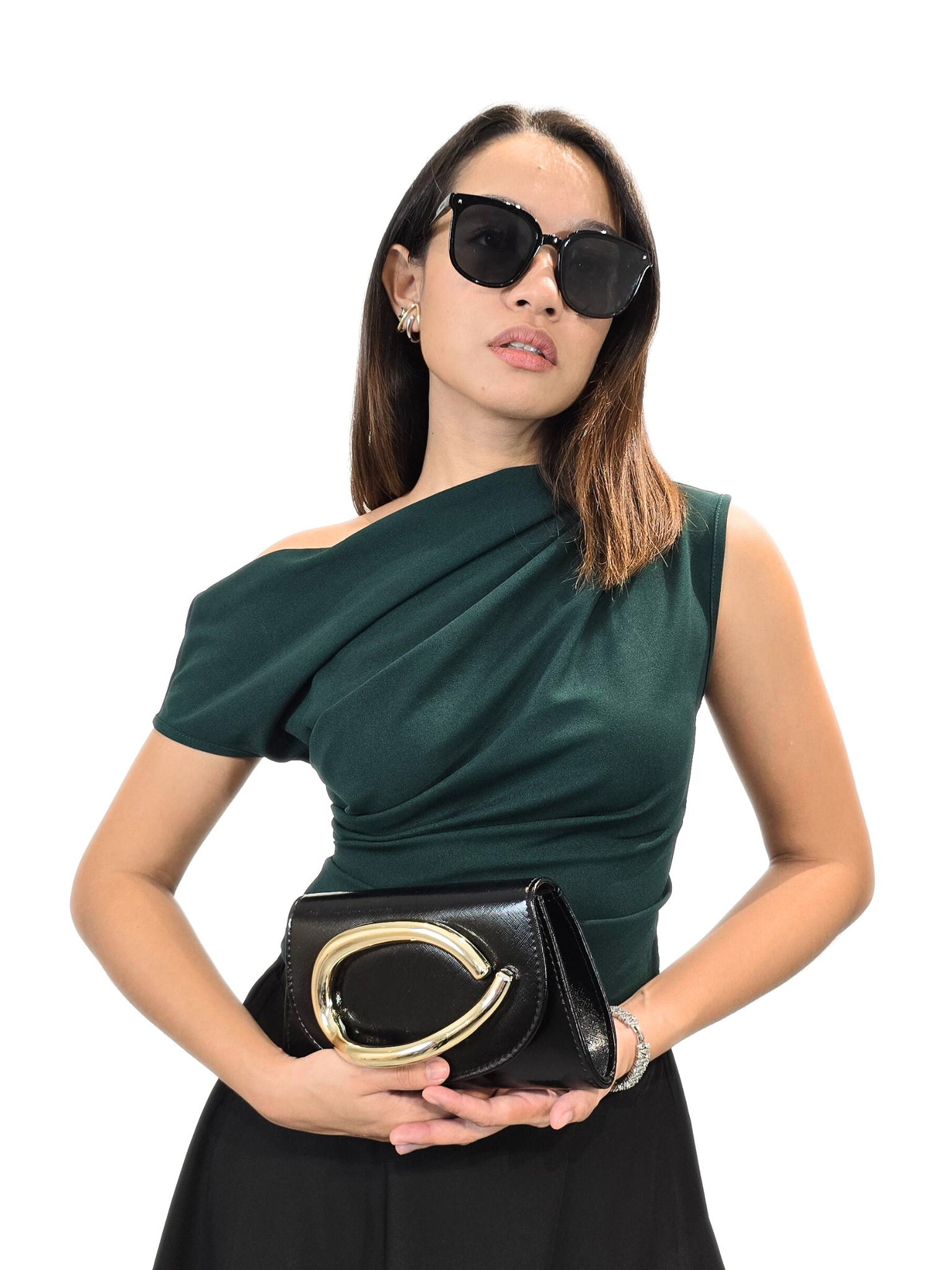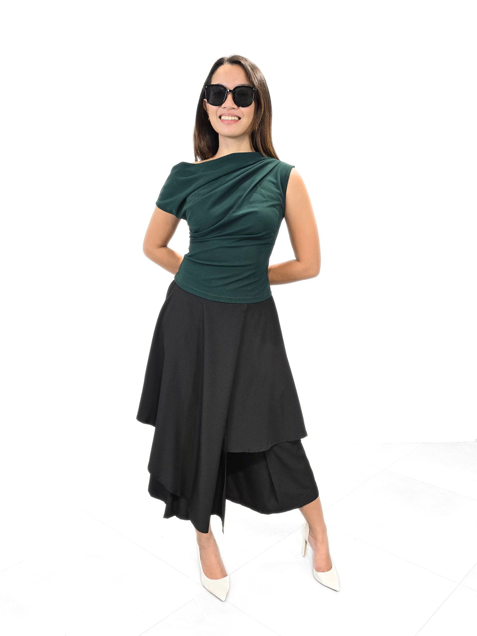 Exquisitely designed Not So Basic Top that combines striking color with architectural draping. The fabric is a rich, deep emerald, offering a luxurious jewel tone that complements any skin tone.