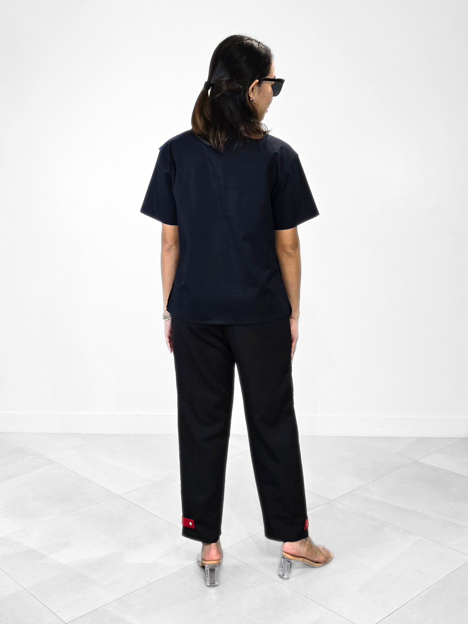 WINSLOW is a navy blue, short-sleeved blouse with a unique and eye-catching detail. The main feature is the attached, oversized bow or scarf-like tie that drapes across the chest. This tie is made from a bold, blue and white plaid fabric, which provides a striking contrast against the dark top. The plaid is tied into a relaxed knot on the shoulder, allowing the ends to fall gracefully down the front. The combination of the classic, solid color and the playful, patterned tie creates a modern and stylish look.