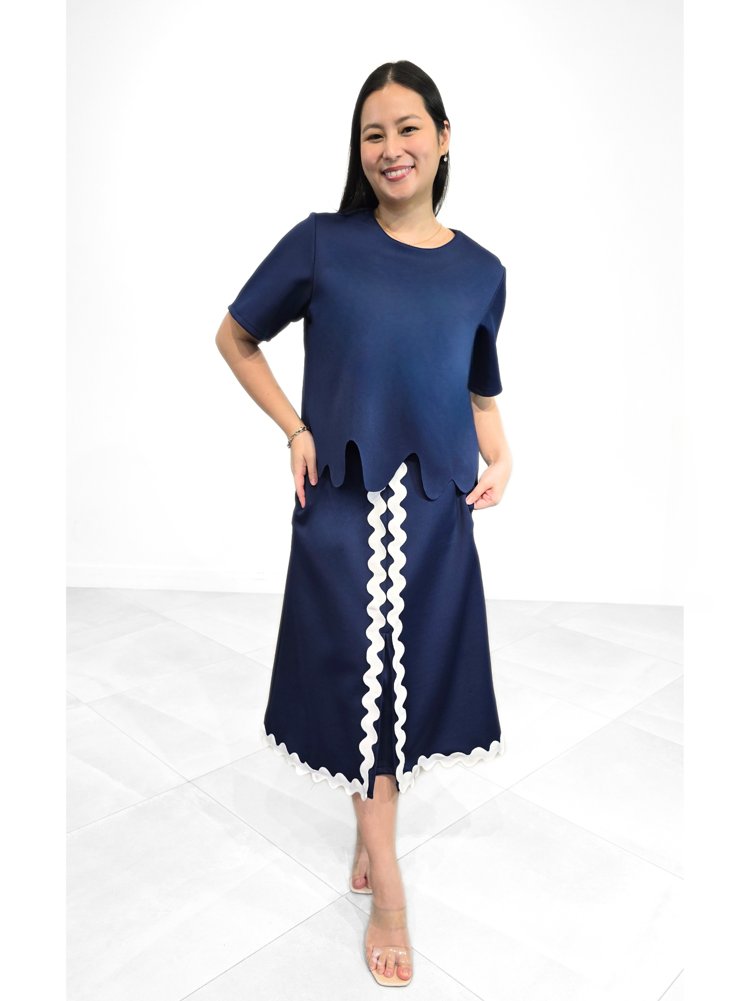 SIENNA top masterfully blends modern silhouettes with artisanal textures. The set features a contemporary navy blue top with a unique, asymmetrical scalloped hemline that adds a playful yet sophisticated movement to the piece. Sienna is a perfect statement for the modern woman who values elegant, structured design with a creative twist.